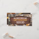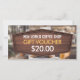 Imaginem o aroma irresistível de mistura de café recém-feita com o calor doce de pastéis recém-cozidos, convidando os clientes a se deitarem. Se o seu compro de café exumenta aquela atmosfera acolhedora e acolhedora, por que não compartilhá-la com o mundo através de um vale-presente cuidadosamente projetado? Um certificado de presente atraente para o café compra encorajar mais clientes a atravessar suas portas com um design que tem toques de madeira rústicos, um fundo de compro de café esmaecido, tudo em tons castanhos ricos. Na frente, você define o preço do vale-presente e no verso da sua cafeteria, local, número de telefone, email e site, juntamente com os termos e condições da sua oferta. Projetado para capturar a essência do seu café, este certificado de presente não só elevará a sua imagem profissional, como também atrairá os clientes a experimentarem o calor e o sabor que você oferece.