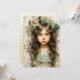 A garota mais bonita de cabelos escuros, vestindo um verde com flores em seu cabelo, para dar a sua neta um cartão de Natal. As costas têm desejos de uma bela neta para o Natal de avós