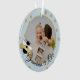 Anuncie seu bebê para estar na vovó para estar com este adorável ornamento fotográfico "Vovó para Abelha" em azul, branco e ouro. Ornamento de abelhão de bumble bonito com pontos de ouro aleatórios, cor de fundo editável e foto. No verso do ornamento, um sobrenome e data de vencimento ou edite para adicionar sua própria mensagem especial à avó a ser.