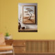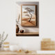 Poster de uma árvore solitária contra um bege sereno e uma paisagem castanha pendurada na parede. A sala também apresenta uma mesa de madeira enfeitada com um vaso cerâmico e uma taça menor. Filtros de luz solar, lançando sutis sombras através da cena.