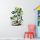 Arte de Wabi-Sabi retrata uma planta estilizada com folhas verdes e amarelas vibrantes crescendo a partir de uma rocha, cercada por folhagem macia e muda. O fundo é leve e pouco discreto, enfatizando as folhas detalhadas e ramos torcidos.