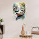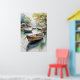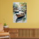 Poster de vários barcos de madeira flutuando pacificamente num rio calmo com reflexos das árvores e casas circundantes na água. O plano de fundo apresenta um verde exuberante e um ambiente suave e nebuloso, transmitindo uma configuração serena e tranquila.