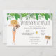 O convite para o fim de semana da festa de bachelorette tropical apresenta uma menina de aquarela em maiô e flores tropicais. Detalhes do evento no verso do convite. Pode ser personalizado para qualquer evento.