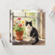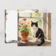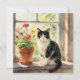 An illustration of a black and white cat sitting on a flower filled window sill. A beautiful card that is blank on the back.
