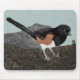 Mouse pad com a minha imagem original e mista de um Towhe Oriental coçando no chão entre agulhas de abeto e galhos caídos. A ave aquosa é, na sua maioria, negra, com um peito branco e lados cor de ferrugem. Por trás está uma pedra grande contra um fundo verde-claro.