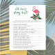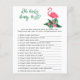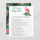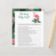 O design de convite para chá de fraldas apresenta flamingo cor-de-rosa com frondes verdes de palma e flores de hibisco tropicais. "Aloha Baby". Um padrão floral tropical com cor preta de fundo se veste na parte de trás do cartão.