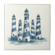 This coastal ceramic tile design features an array of lighthouses in varying sizes in a classic blue and ivory white color palette. The flowing, hand-painted look of curving stripes creates a sense of movement, while the watery texture add depth and a calm, ocean-inspired atmosphere. A beautiful accent piece for beach-inspired interiors and serene seaside spaces. Note: design may contain generative content