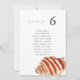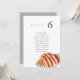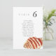 Minimalist and elegant wedding table number seating chart cards featuring a watercolor painting of a seashell. The pairing of the soft watercolor beach scene and the chic typography makes for a beautifully chic combo.
