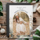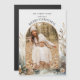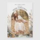 This warm holiday greeting features a classically elegant gold-bordered arch photo template, text fields, curved Merry Christmas greeting and artistic watercolor style brown, gold and gray pine and winter botanicals on a subtle eggshell textured background.