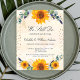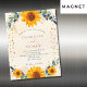 A trendy wedding Save the Date magnet. A golden watercolored background decorated with sunflowers, eucalyptus foliage, golden foliage and faux gold glitter dust. Personalize and add a date, names and text. The text: Save the Date is written with a large trendy hand lettered style script with swashes.