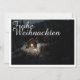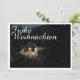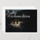 Die Karte zeigt eine stimungsvolle, winterliche Szenerie mit einer kleinen, beleuchteten Holzhütte inmitten eines verschneiten Waldes. Die warme Lichtquelle im Inneren schafft einen schönen Kontrast zur dunklen, friedlichen Umgebung. Der elegante "Feliz Natal"-Schriftzug em Weiß verleiht dem Motive eine festliche Nota. 🎄 ✨ Deutsch