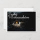 Die Karte zeigt eine stimungsvolle, winterliche Szenerie mit einer kleinen, beleuchteten Holzhütte inmitten eines verschneiten Waldes. Die warme Lichtquelle im Inneren schafft einen schönen Kontrast zur dunklen, friedlichen Umgebung. Der elegante "Feliz Natal"-Schriftzug em Weiß verleiht dem Motive eine festliche Nota. 🎄 ✨ Deutsch