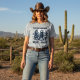 "This detailed and atmospheric design features a woman, seen from behind, wearing a cowboy hat, jeans, and a fitted shirt, standing next to a powerful horse. She appears to be looking out over a rugged desert landscape with mountains, cacti, and a barbed wire fence. The black and white, or monochromatic blue, color scheme gives the image a classic, vintage western feel. This design is versatile for a range of products associated with western culture, equestrian themes, and outdoor adventure. Imagine it on apparel, home decor, rustic artwork, or accessories for those who appreciate the spirit of the frontier."