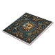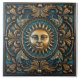 A square tile featuring a golden sun face in the center, surrounded by ornate floral patterns, all set against a teal background. The sun's face is smooth with a serene expression, framed by sharp, triangular rays. The floral designs are intricate, with curling leaves and stylized blossoms, all rendered in a metallic gold finish.