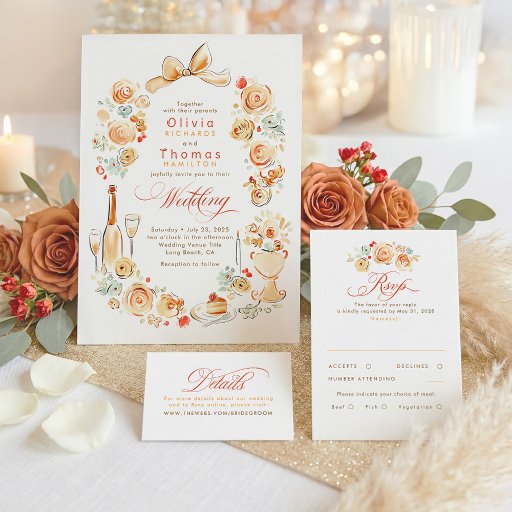 A charming hand-drawn illustration of candlelight, florals, and a sweet slice of cake adds a cozy, celebratory touch—like a little peek at the table where the magic happens. Fall menu cards are perfect for couples who love thoughtful details, long tables, and a wedding celebration that feels warm, personal, and joyfully untraditional.