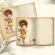A charming vintage-style junk journal page featuring a whimsical shy girl with voluminous curls and a soft headband, gently reading her book among delicate florals. Warm parchment tones and subtle antique textures create a nostalgic, storybook feel that brings softness and character to any stationery collection.