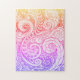 Este quebra-cabeça apresenta um design abstrato e intrincado cheio de padrões giratórios, espirais e semelhantes a penas. O trabalho de arte transita suavemente através de um gradiente de cores quentes a legal — começando com amarelo e laranja no topo, passando para rosa e finalmente se misturando em tons azuis e roxos no fundo. O efeito global é vibrante e dinâmico, com um toque de mão, capricho.