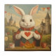 Fall in love with this charming and unique take on the White Rabbit from Alice in Wonderland! This delightful illustration portrays a cute, anthropomorphic white rabbit seated at a rustic table, holding a heart-adorned invitation or card. Dressed in a whimsical red and green outfit, he's ready for a tea party in an enchanting landscape dotted with fairytale castles, colorful banners, and blooming flowers. Teacups and a cake complete this sweet and imaginative scene, perfect for fans of Alice in Wonderland and anyone who adores whimsical, heart-filled art.