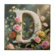 This design is special because it features a glossy, cracked white letter D adorned with dew drops and immersed in a lush, sunlit garden setting. It is richly decorated with a vibrant array of soft pink roses, orange flowers, and bright yellow blooms intertwined with green ferns and climbing vines. The composition is whimsical and rustic, making it perfect for a nursery, wedding, or nature-themed decor.