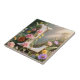 This design is special because it features a smooth, glossy white letter L adorned with dew drops and immersed in a lush, sunlit garden setting. It is richly decorated with a vibrant array of soft pink and peach roses, purple flowers, and bright yellow blooms intertwined with green ferns and climbing vines. The composition is whimsical and rustic, making it perfect for a nursery, wedding, or nature-themed decor.