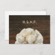 Um RSVP de casamento com uma imagem de rosas brancas no fundo sobre um fundo de madeira marrom-escura. Personalize o texto com detalhes da sua ocasião.