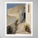 A whitewashed Mediterranean village stairway with stone steps, curved walls, and potted plants, capturing the character of coastal architecture in warm sunlight.