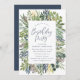 Convide amigos e família para a festa de aniversário em estilo com nossos incríveis convites de aniversário Wild Meadow. Os convites de aniversário na moda apresentam um quadro de folhagem de aquarela em tons de verde e azul marinho complementados por uma fonte de script que flui. Personalize os convites de bolsa mensageifesta de aniversario elegante adicionando os detalhes da sua festa e defina o tom para a sua festa!