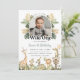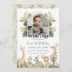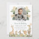 Um convite de primeiro aniversário selvagem que apresenta gráficos animais safari, espaço para uma foto e uma fonte moderna. Este convite para na moda é perfeito para uma festa de aniversário com tema animal para um menino. Par com qualquer coisa da coleção da OSCAR para um olhar coeso.