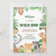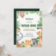 Uma selva gira temeu o primeiro convite de aniversário em aquarela, representando uma selva tropical selvagem, completa com uma coleção de animais lindos e selvagens. Este tema apresenta animais selvagens e aves como elefante, chita, girafa, zebra, macaco, tucano e avestruz, moldando o cartão. O cartão apresenta uma tipografia texturizada 'Wild One' personalizada exclusiva. A cor de fundo pode ser personalizada de acordo com a sua necessidade.