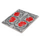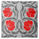 Azulejo cerâmico numa vintagem William Morris padrão têxtil de flores e folhas estilizadas de pântano - flores num gradiente de vermelho escuro a vermelho brilhante, com cinzas de grafite/folhas de cinza, sobre um fundo de cinza de prata clara