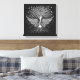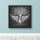 Asas, árvore e raízes, em prata metálica, simbolizando asas para voar com detalhes de aves, corações e flores em fundo preto. A trabalho de arte apresenta o texto, "Dê àqueles que você ama asas para voar, raízes para voltar e razões para ficar. Ela voa nas suas próprias asas. Enraizada no amor, ela floresce." Canvas esticada