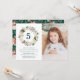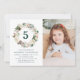 Convite de aniversário floral de inverno elegante, com a idade da criança rodeada por uma coroa de flores de marfim, bagas sagradas, cones de pínus e folhas verdes e peludas. Personalize os convites de aniversário de inverno adicionando o nome, a foto e os detalhes da festa da aniversariante. O reverso dos convites apresenta um padrão floral de inverno correspondente com belas poinsettias de aquarela em um fundo verde.
