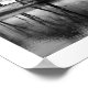 Uma fotografia branca e preta de árvores num banco de neve refletida no grande lago abaixo criando um padrão de inverno.