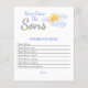 This charming Wishes For Boys Game card features a smiling watercolor sun and blue clouds with the words "Here Come The Sons" in stylish typography.