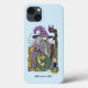 Um mago todo em roxo segurando um funcionarios que tem uma bola de cristal roxo. Um pequeno dragão verde, nó celta funciona, vela e uma borda de outono deixa tudo num pano de fundo azul claro