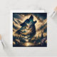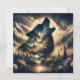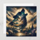 Imagem dentro de uma fotografia. Um lobo uivando na lua com montanhas e fundo florestal.