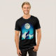 Tee numa silhueta negra de um lobo, uivando em uma grande lua cheia, parado em um pico de montanha com gelo coberto de montanhas ao fundo