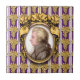 A ilustração original de ZoeSPEAK sobre este pequeno Azulejo cerâmico apresenta um retrato do compositor de música clássica Wolfgang Amadeus Mozart. O retrato é um perfil definido em um quadro de ouro oval de ornamentado. A armação pende sobre um fundo de papel de parede roxo com cachos de uvas em filas e listras brancas e lavandas verticais.