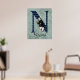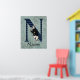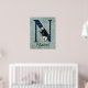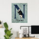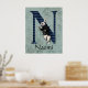 A design de Whimsical para Alice no País das Maravilhas, amantes de todas as idades, apresenta letra maiúscula / inicial N com preenchimento de harlequin preto e azul e ilustração original do Rabbit Branco que foi pintada, em um fundo de cor azul-azul, floral e vírgula angustiado. Personalizar com nome ou outra mensagem