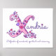 O nome de arte do monograma X bonito é poster perfeito para uma sala de meninas em tons de rosa, roxo e azul escuro em um fundo branco que pode ser alterado se necessário. Personalize com seu próprio nome começando com X, e nome que significa toque personalizado para seu quarto, sala de jogos ou berçário, este exemplo é para o nome Xandria Defender da humanidade, espiritual e visionário. Impressão de poster bonitinho ideal para um novo bebê, batizar ou dom de chá de fraldas. © Monograma único X corações e flores desenho descrição e design de arte gráfica por Sarah Trett. www.sarahtrett.com para www.mylittleeden.com