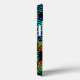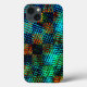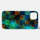 Xadrez com riscos cruzados, azul escuro e arranhões em azul-claro e laranja esverdeados com tintas avermelhadas e bordas escuras - nos traços - que podem causar a percepção de sujeira ou manchada.