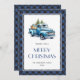 Xadrez de búfalos azuis Cartão de Natal Merry com um caminhão de retro azul. Personalize facilmente este cartão de festas de neve com o seu nome familiar e o ano.