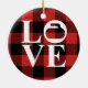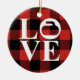 Enfeites de natal com texto LOVE e rocha ondulante em fundo de xadrez de búfalo vermelho. Perfeito para curtidores e ventiladores.