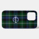 Na moda capas de iphone feita no padrão tradicional de xadrez de tartã escocesa azul e verde Campbell. Um monograma de letras azuis e um texto branco personalizados está pronto para personalizar para você mesmo ou como uma ideia de presente de excelente.