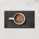 Uma foto de uma xícara de café em lenha preta mantém seu nome comercial em um tratamento estilizado de texto neste modelo de cartão de negócios profissional. Entre em contato com o designer se precisar de ajuda com nomes maiores ou layouts de texto alternativos. Este design faz parte de uma série de garantias comerciais correspondentes. © 1201AM CREATIVE