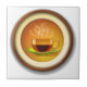 Café quente numa xícara de vidro, armação redonda e a inscrição Café.