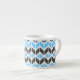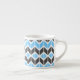 Esta taça espresso moderna apresenta um padrão geométrico colorido de herringbone em tons azuis e escuros de cinzas.