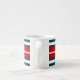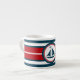 Design náutica com decoração em forma redonda de embarcações à vela, em fundo listrado vermelho, azul e branco