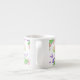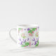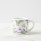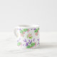 Uma bonito caneca de café Espresso, com um padrão de Rosas cor-de-rosa, Blossom Laranja Mock branco cremoso e Lavanda roxa, de uma design de cor d'água pintada à mão por Judy Adamson.