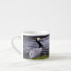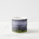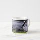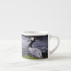 Em tons suaves de blues, cinzentos e castanhos, o pelicano marrom na fotografia original de MaeFlowers nesta Copa Espresso está posando na beira da água, esperando o peixe passar na natação. A luz reflete as penas brilhantes e destaca as ondulações na água. Um pouco de grama verde ao longo do fundo termina a foto.